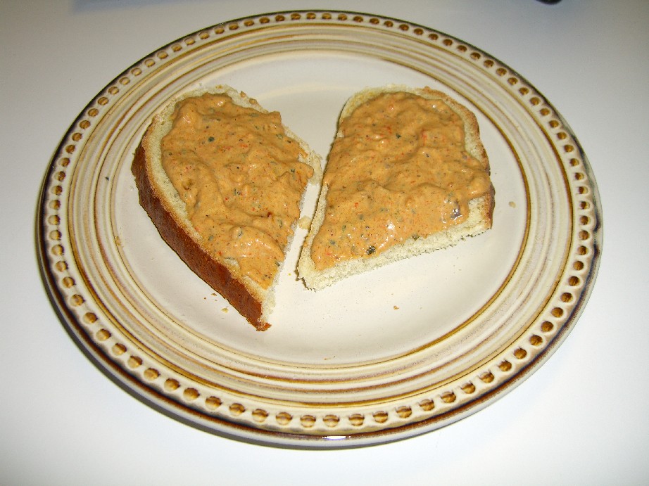 Brown’s Roasted Vegetable Spread. This stuff is the bomb diggity. Not only is it rediculously easy, but it is TASTY. I spread it over my homemade bread, lightly toasted, and had a fantastic meal.