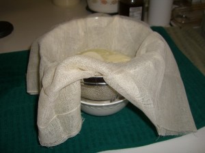 I read somewhere that the longer yogurt “cooks” the more the cultures eat the carbohydrates in the milk. Therefore, the longer you leave it in the warmth the fewer carbs you will have in your final product. Since I was trying to trim a pound or two a decided to do the same thing again but this time I left it for 18 hours instead of 12. It turned out about the same looking and tasting. If it had fewer carbs I’ll never know, but I took another step toward diet yogurt by making yogurt cheese.