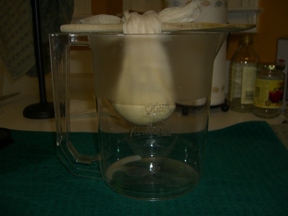 I poured the yogurt into a strainer covered with cheese cloth over a bowl and let it drain for three or four hours. Then I tied up the cheese cloth around the handle of a spoon, ditched the strainer and let it hang in the pitcher until it had drained off all the whey (apparently a source of carbs). I squeezed it out a little bit and the resulting chunk of cheese kind of had the consistency cross between ricotta and goat cheese. Firmer than ricotta, but not as solid as goat cheese.