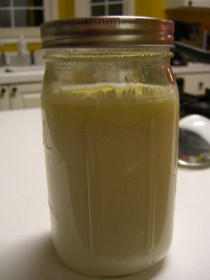 I warmed a quart of whole milk on my gas oven to just barely 110 degrees. I stirred together in a quart sized wide mouthed Mason jar (I love those things) a few tablespoons of warm milk and a big tablespoon of purchased whole milk yogurt. I poured the rest of the milk into the jar, lidded it, and stuck it in the oven which had been preheated to about 200 degrees. I shut the oven off and turned on the oven light. Then I said a small prayer and left it overnight.