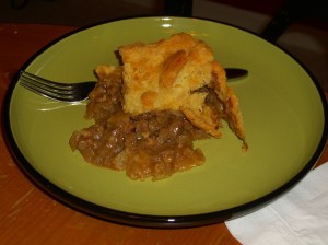 To say it was a hit is a woefully sad understatement. Seconds were a given. The crust was a hit. The bacony, beefy, porky, not-offensive-oniony filling was a spiritual experience. Tender, just the right saltiness, and mixed with the crust…it cannot be properly expressed in the English language. I could have died then and there and have been satisfied. If I was carrying a piece of this pie, I would be able to get in the express line for heaven. Angels would be jealous.