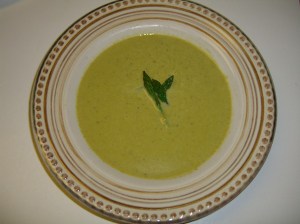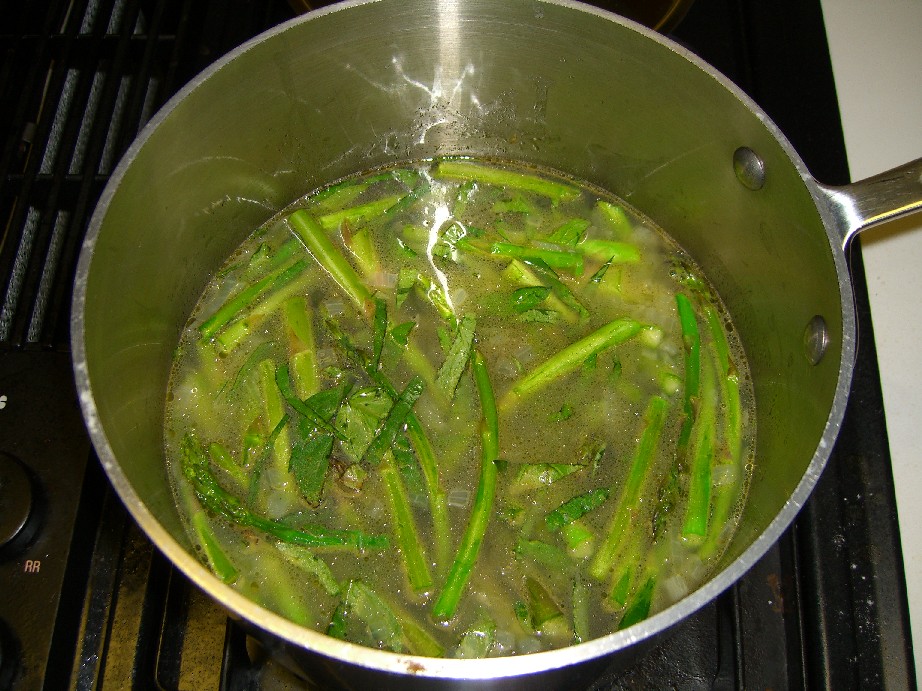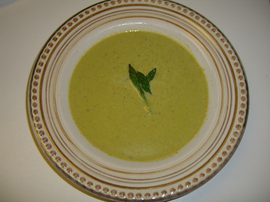 butter, then add two pounds of cut up asparagus and my homemade chicken stock and fresh basil. It simmers for about a half hour, then pureed within an inch of its life. Straining it through a colander is a good idea, but use one that’s not too fine otherwise it will sit there and hold the soup rather than strain it (I know). A food mill would probably work well too but I haven’t’ tried that. Anyway, if you don’t strain it at all you end up with little woody pieces randomly in your soup. Kind of messes up the elegant effect. And when you’re serving heads of state, high class foodies or your husband’s boss you just don’t want to kung faux pas the elegance.