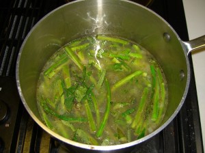 Meanwhile, back at the stove, I still had two pounds of asparagus and I knew exactly what to do with them. A few years ago I discovered this cream of asparagus soup recipe in an old cookbook, quite similar to this one. It sounds a little funky but man, oh man is it ever good! Anyone who says they don’t like asparagus should try this.