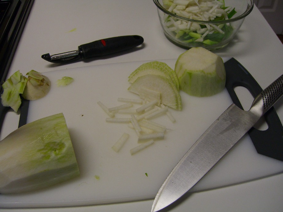 My Korean tutor Tess and I have been discussing kimchi as I shared with her some of my pickling experiments. When she asked me again if I was going to try to make it, I said absolutely. The next thing I knew I was up to my ears in a veritable kimchi to go kit. Tess gave me just the right kind of cabbage, daikon, hot pepper powder, fish sauce, green onion, salt and a starch (flour and water mix) that she likes to use to thicken the sauce. Along with a loose set of instructions, she gave me a sample of her own kimchi which I prompty ate.