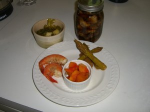 My pickle frenzy resulted in a large variety of pickled items in my fridge. They are kind of taking over. So far I’ve pickled asparagus, butternut squash and pumpkin, shrimp, beets, mushrooms, broccoli, apples and onions. Yes, I pickled shrimp. The recipe calls for white peppercorns but I didn’t have any so I used black…I can see why she said to use white peppercorns. The black ones kind of look like…eyes…
