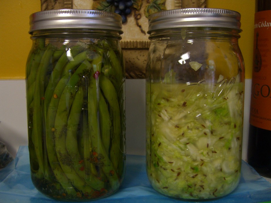 Pickled green beans (left) and sauerkraut (right) sitting on the counter to ferment.