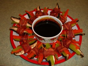Anything could come out of Mom’s kitchen. You just never know. And Mom is inspired by lots of things. She’s one of those people that will see or taste something good, then go home and try to make it herself, being mostly successful on the first try. She was inspired by a picture from a from a friend at her church. His mother sent it to him from the other side of the world – a picture of her carrots, celery and mushrooms wrapped in bacon with a dipping sauce. I guess she was trying to make him homesick!
