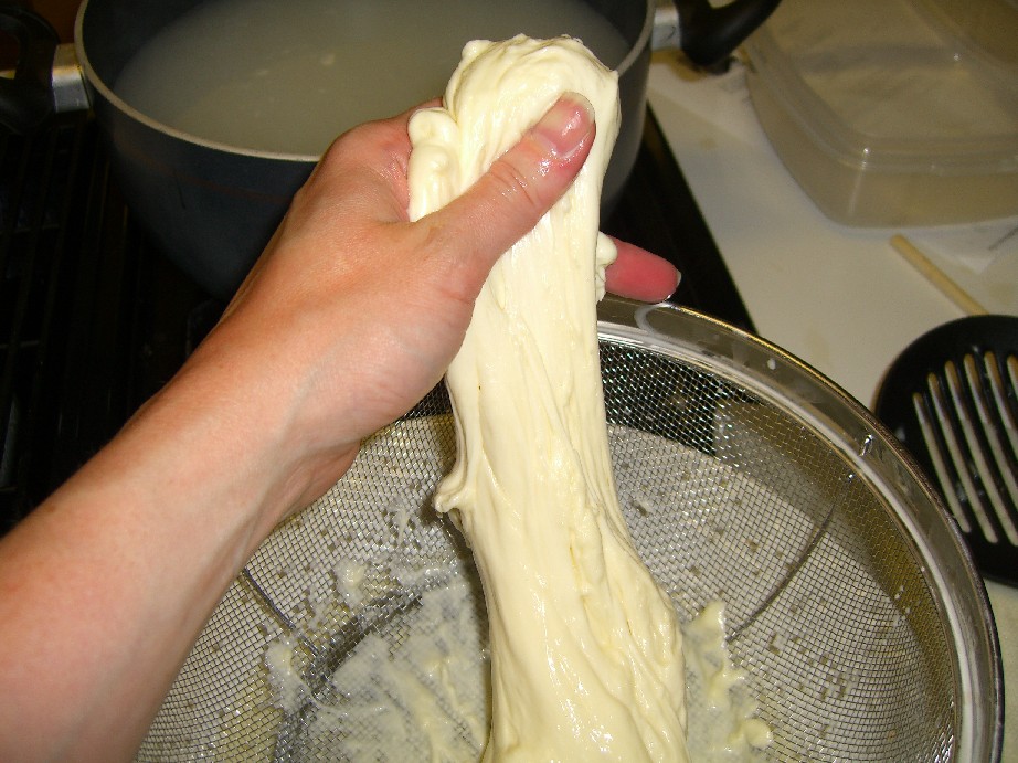Handling stuff that hot is not easy. As soon as the mozzarella is cool enough to handle, it’s not hot enough to stretch. Back into the hot water, where it gets hot enough to stretch but too hot to handle. *sigh* So I did as best I could without totally cooking my fingers.