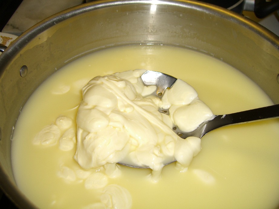 First, there are two options for heating the curd before stretching: hot water on the stove and the microwave. Since I don’t like to use the microwave much at all these days, I opt for the stove top version. You heat the water to 185 degrees. Note: this is FREAKING HOT, almost boiling. I have a high tolerance for heat and this business is HOT. You are supposed to pull the curds out of this hot water and stretch it like taffy.