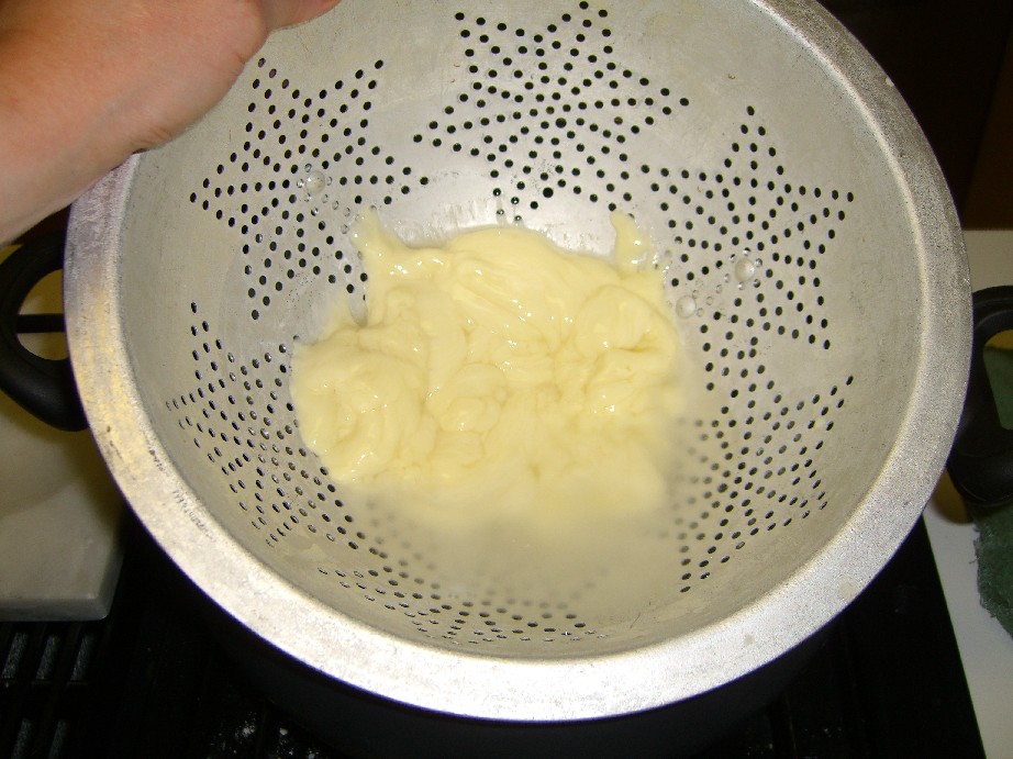 Note: in the hot water bath you have a colander and the curds go into the colander. Do not use a wire mesh colander. I did that the first time and it took for-ev-ER to get rid of all the little cheesy bits stuck in between the wires. The second time I used an old, more solid colander like this one and it worked MUCH better. Far easier clean up.