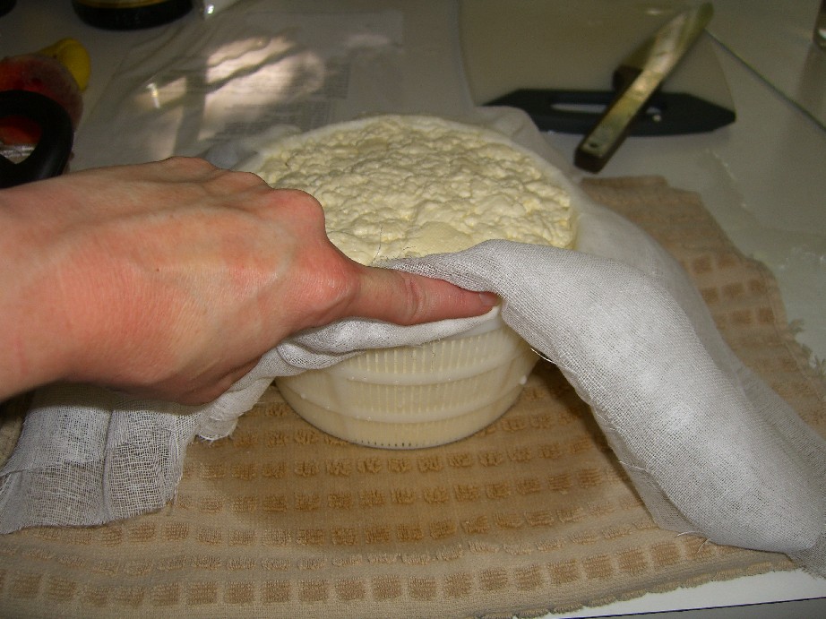 Finally my cheese was pressed and ready to dry. I put it on a wooden cutting board at room temperature for a little over four days, turning regularly for even drying. I put a mesh colander over it to keep away flies and cat hair.