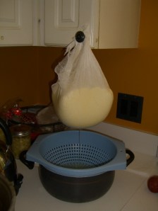 By this time I had opened a bottle of wine. If my cheese was going to be destroyed, at least I would care less. It was time to drain. I poured the curds into a cheesecloth lined strainer, then tied it up in a bag and hung it to drain out.