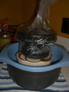 The next part was tricky. You put the giant pot in your sink full of hot water and slowly bring the temperature up to 100 degrees, not faster than two degrees every five minutes. I have no freaking idea how you are supposed to have that much control in your kitchen sink. I added hot water from my kettle a bit at a time into the water around the pot. As expected, it didn’t raise the temp, didn’t raise the temp, then started shooting up much faster than two degrees in five minutes. *sigh*