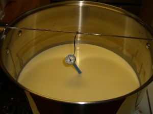 I diligently re-read through the instructions and began heating my milk. Two gallons of milk over low heat takes a geologic age to reach 90 degrees. But I finally got it there and added my Mosphilic direct set culture. (What IS this stuff and where would I acquire such a thing if the world structure blew up and it was just me and a cow in a mountain shack?? I must investigate.)