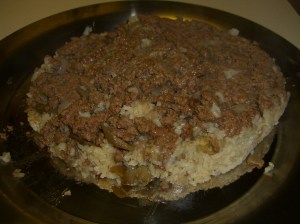 Slice eggplant I ½” slices and peel (break cauliflower into flowerets. With a little oil brown the eggplant slices or the cauliflower and set aside. Cook onion in oil until soft but not brown, Put meat into pan with onions and brown meat. Place meat/onion mixture in Dutch oven or other heavy pan with straight sides. Arrange eggplant slices or cauliflower on top0 of meat mixture and cover with rice. Add salt and pepper then the water and bring to boil then simmer on low heat for 45 minutes. DO NOT LIFT THE LID. Let stand for about 15 minutes and while it is standing sauté pine nuts in a little butter or oil stirring constantly so as not to burn the nuts.