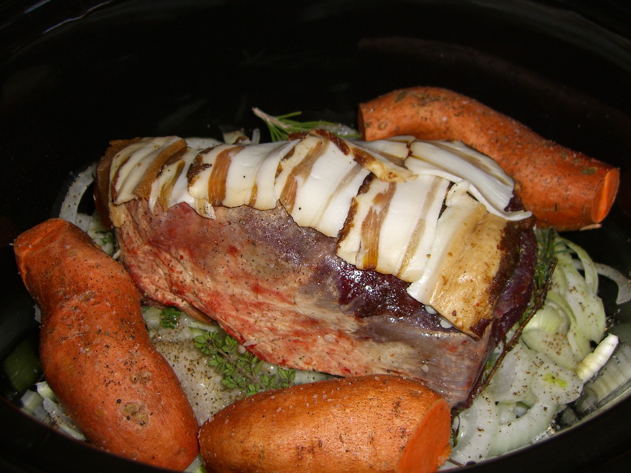 I layered the onion and fennel on the bottom of the crock, laid the herbs on top, then the roast. I fit the potatoes in around the roast and laid the slices of fatty bacon on top of the roast. I did that for several reasons. First, my crock roasts often get a little dried out on top so I figured the bacon would help keep it moist. Second, it would flavor the roast as the bacon fat melted and rolled down the side. Finally, what gets WORSE when you put bacon on it??