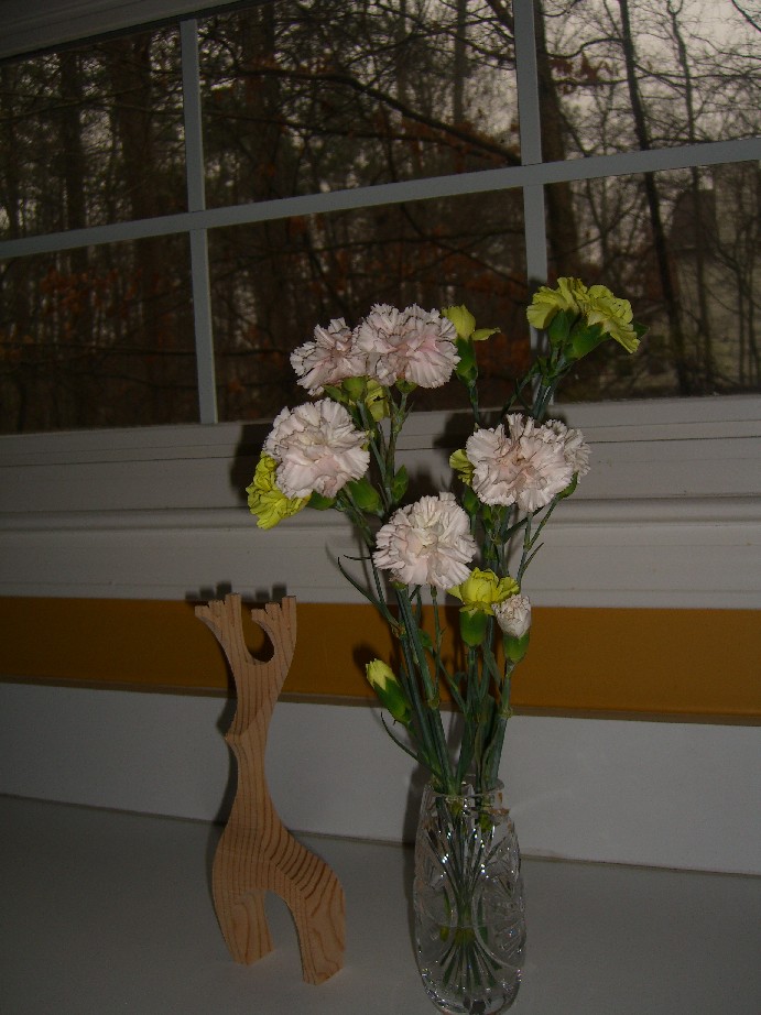 Dreary Monday in background. Happy flowers and a little wooden reindeer Test Subject Bill made me brighten the day!