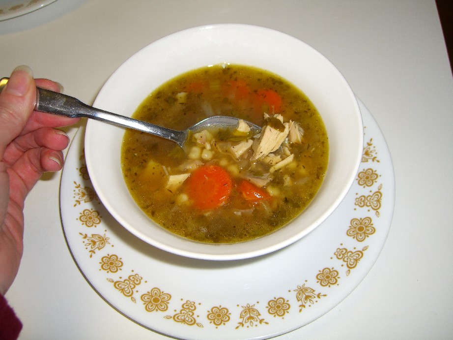My soup’s final touch – chopped leftover roast chicken – went in the pot and got heated through. Even my suburban version takes some time. Although someday I hope to make it the way Mom did, by stepping outside and chasing down my own bird.
