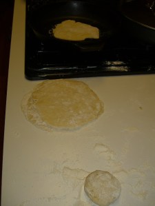 Anyway, I mixed up my flour and baking powder and salt. When it came to the lard, it calls for two tablespoons. Two…for four cups of flour? No way. I used four tablespoons of lard. That made me happy. The water went it and I mixed it all up, then split it up into 24 little balls. Things were getting exciting. I was ready to roll out and fry ’em up. I heated my Lodge cast iron skillet and rolled out my first tortilla.