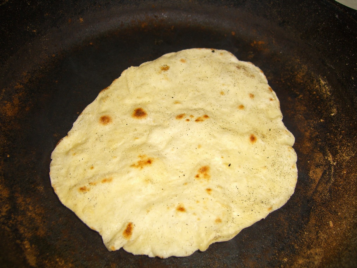 It was reasonably round, although it took a lot of flour to keep it from sticking to the counter. I tossed it in the hot skillet and got to work on the next, and the next. Each tortilla got flipped shortly after it bubbled up. Brown is good, black is bad. Simple enough, right? All was well until Test Subject Bill came down stairs and started looking around the kitchen.