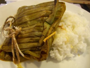 The snapper dish was really interesting. We made the curry sauce first (which tasted almost exactly like the red curry I get from my favorite Thai place – wow!) and let it cool while we prepared the fish. We cut banana leaves into strips, then crossed them, added the fish and some sauce and wrapped them up. Using kitchen twine, we tied them up and into the oven they went for a steam. The fish turned out really delicate and moist.