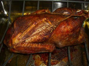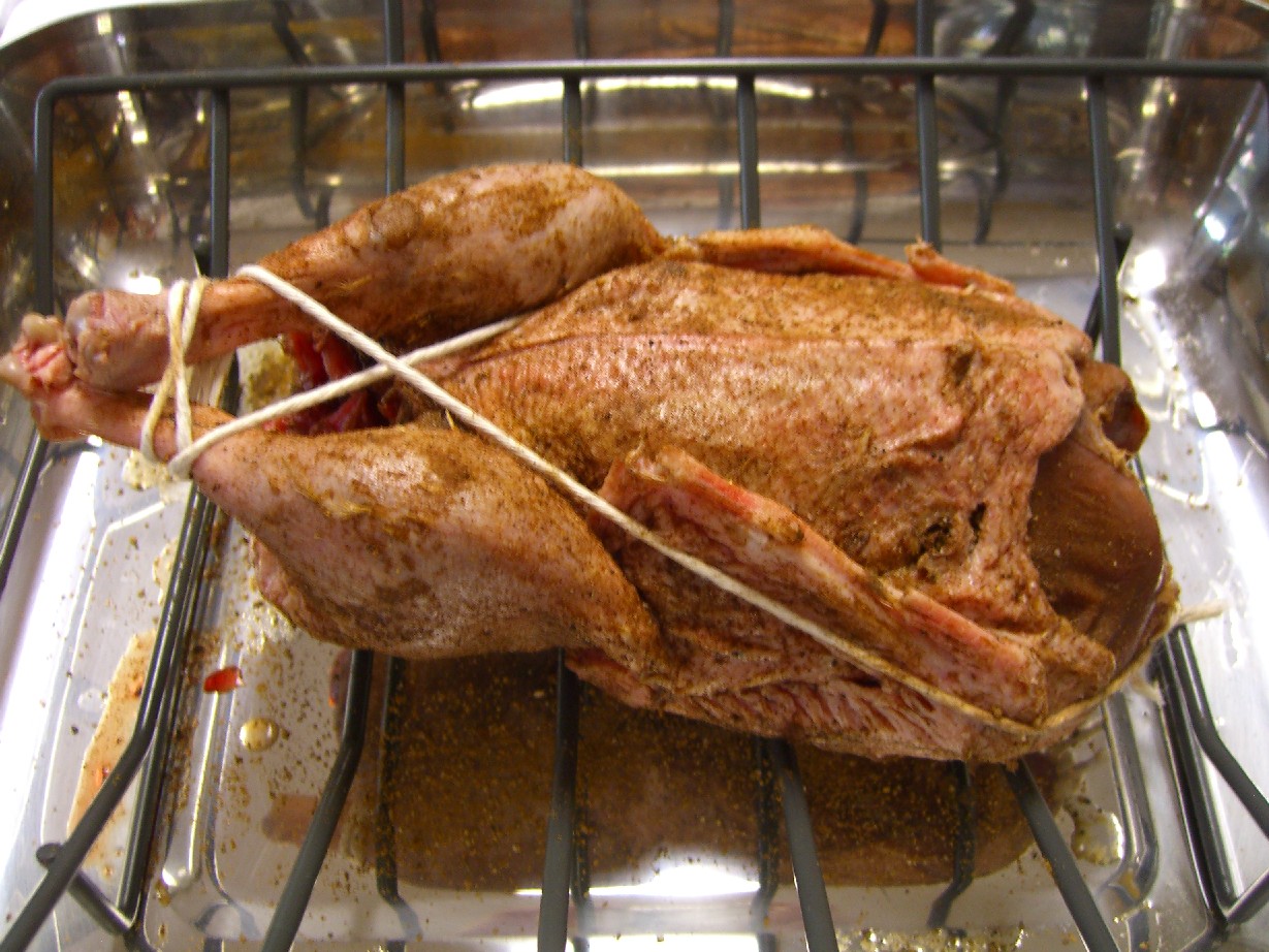 I pulled the roast duck recipe from Mark’s Daily Apple (yes, I’ve been hanging out with the primal crowd lately) and used the Spice Seasoning and the Orange Honey Sauce. After liberally seasoning, I trussed a duck for the first time (well, any fowl actually). For chickens it doesn’t seem to matter much to me but the duck legs were way out there so I decided to tie him up. It’s actually much easier than it looks. Into the oven the bird went and I focused on my other dishes.