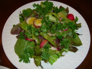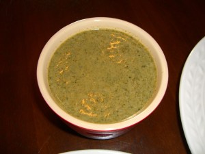 I made some mashed potatoes to please my sweetie, threw together a salad with shallots and red wine vinegar, and got some sugar snap peas ready for a quick saute (sauteed them in bacon fat – heck yeah!) I had some swiss chard from my CSA hanging out in the crisper that had gone pretty wilty on me, so I decided to try a cream of swiss chard soup. Since it turned out really well (test subject Bill even ate the leftovers!) I thought I’d post what I did here:
