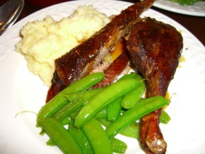 Seasoned roast duck with orange honey sauce, sauteed local peas, buttery mashed spuds