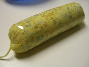To make a log out of it, spread the butter in long row on some plastic wrap, then fold the wrap over the top of it so the butter is surrounded with the wrap. Squeeze and form into a log. Twist the ends, then pick it up by the ends with both hands and spin it. That will squeeze it into a tight log and you’ll be left with twisted sealed ends on the wrap. Chill thoroughly before attempting to unwrap or cut.