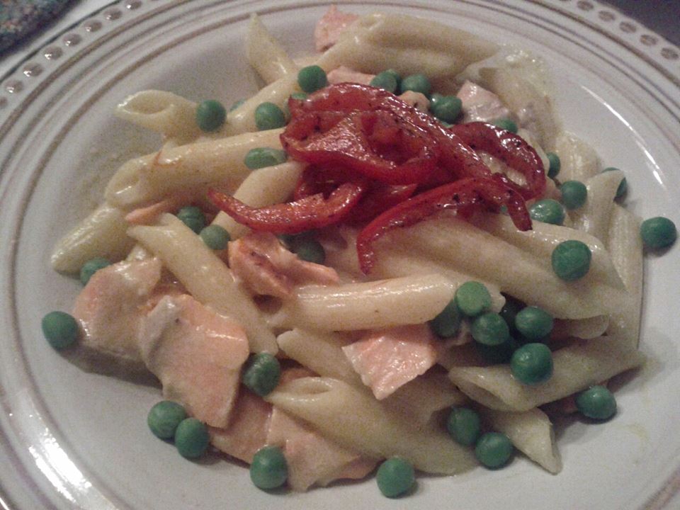 When the sauce is thickened to your liking, combine the sauce, penne, salmon chunks and strained peas. Top with the red bell peppers.